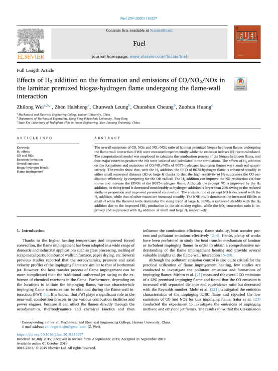 研究团队目前针对生物质气-氢气可再生能源的清洁高效利用,开展了广泛的基础应用研究,促进了对该可再生能源基础特性的认识和理解,为该可再生能源的清洁高效利用提供了多方面的理论支持。该研究得到了香港RGC项目(B-Q39F)和古天乐代言太阳集团科研启动经费(KYQD(ZR)-1905)资助。