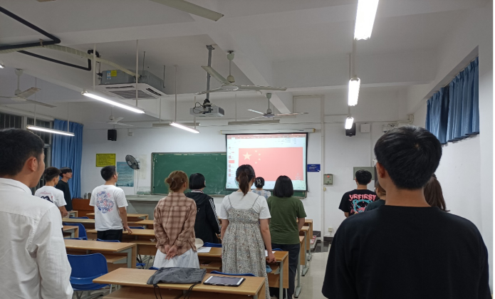 会上,邵煜潇同学传达了会议精神,并简要介绍了会议流程。接着,邵煜潇同志主持开展会议流程第一项,全体起立奏唱国歌,同志们对着红旗慷慨激昂唱起国歌。