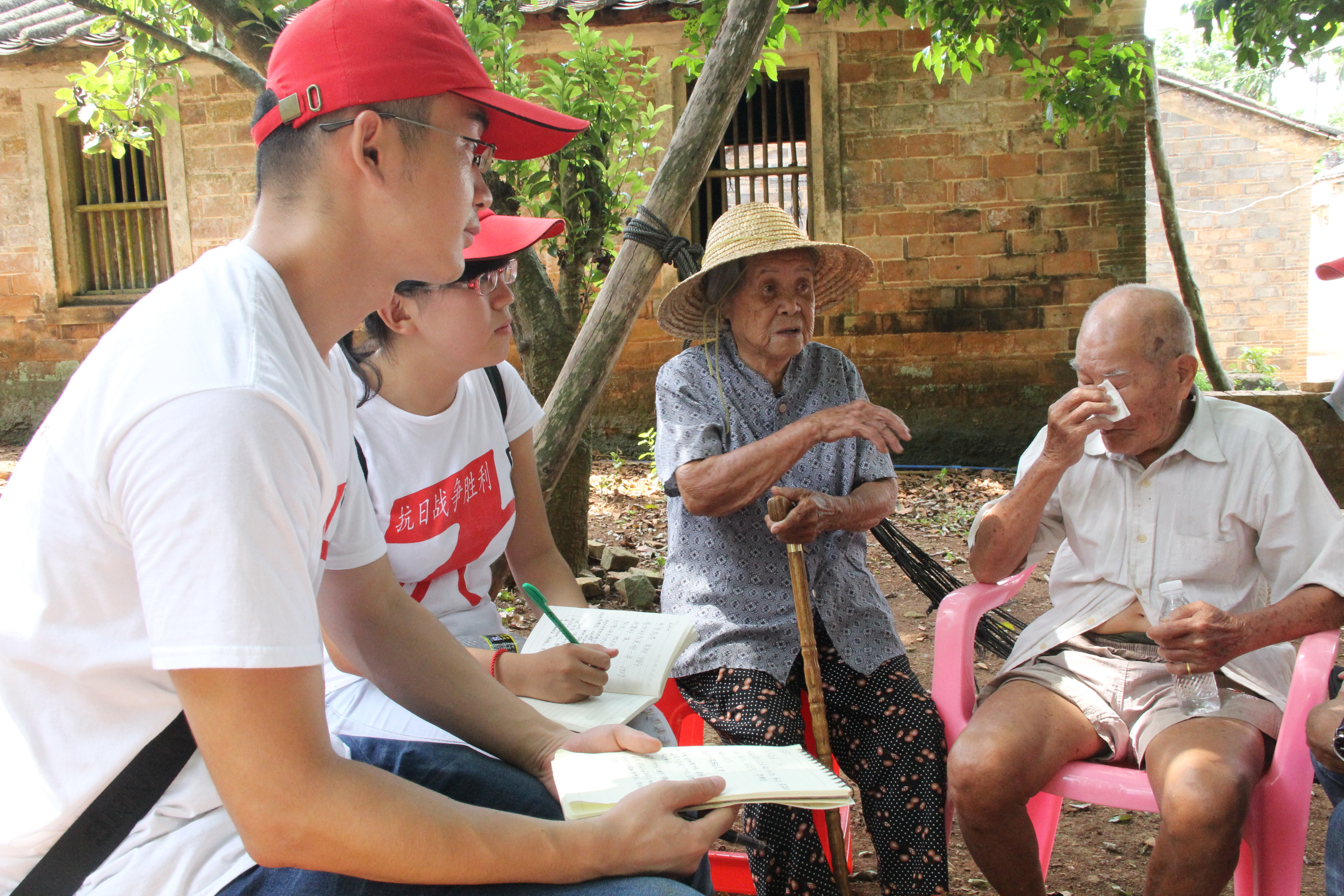 寻访团在镇政府的帮助下,对南新村的符之椿、王祚兴及陈玉颜同志,南联村的杨庆贵、莫惠兰同志等10名抗战老兵进行了深入采访。印象深刻的是王祚兴与陈玉颜夫妇,他们1939年入伍,王祚兴加入武装部游击队,陈玉颜参加后勤部。当时南阳地区多处被日军划分为“无人区”,日军常年驻扎扫荡村庄,实行惨绝人寰的三光政策,其暴行罄竹难书。在树德村,革命队伍曾多次狙击日本侵略者,其中最惨烈的一次是夫妇随游击队一个中队约200名战士在大榕树下伏击日本鬼子,却不料狡猾的日本鬼子从新桥抽调兵力支援南阳。由于我军都是步枪且仅有一把机枪,而日军装备精良且出动飞机轰炸,在侵略者强大的空中力量和火力下,我军惨遭重创,绝大多数战士都牺牲了,作为幸存者每每回忆起这段历史老人家的泪水忍不住留下。