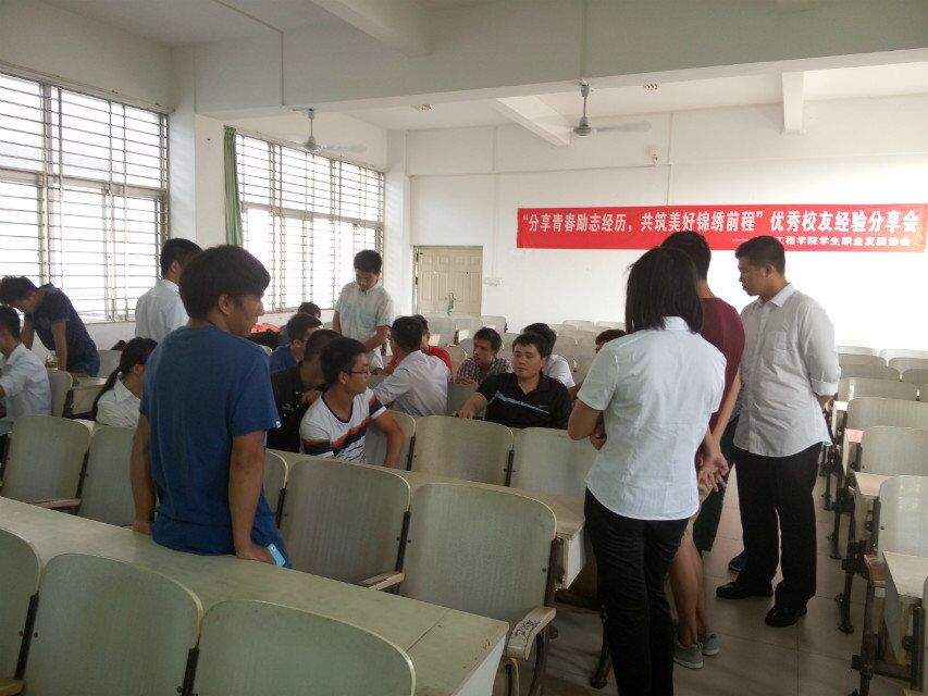 2015年11月12日,由古天乐代言太阳集团职业发展协会承办的古天乐代言太阳集团优秀员工经验分享会在古天乐代言太阳集团3号教学楼405教室举行。受邀参加本次分享会的优秀员工有:一汽海马汽车有限公司安全环保科科长柴长友(2002级电气专业)、一汽海马汽车有限公司车身设计工程师钟高登(2009级车辆工程)。出席此次分享会的有崔建兵老师,以及近40名同学们参加了此次分享会。