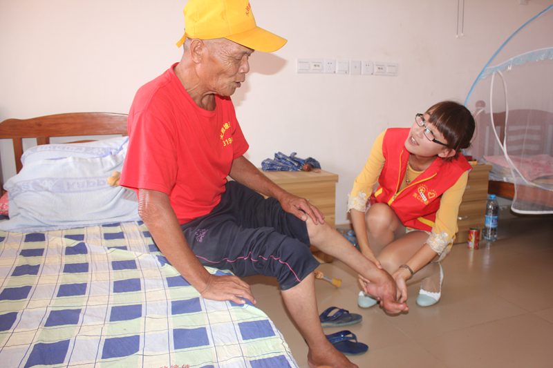 志愿者给老人按摩、聊天