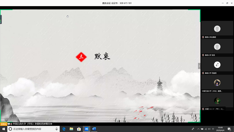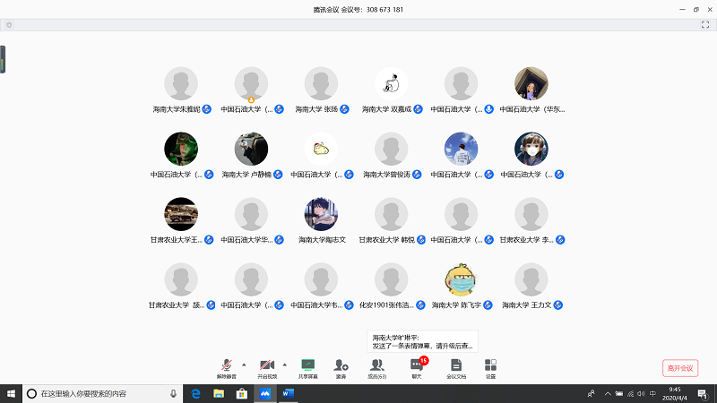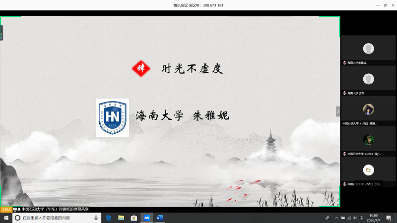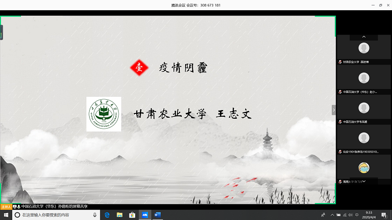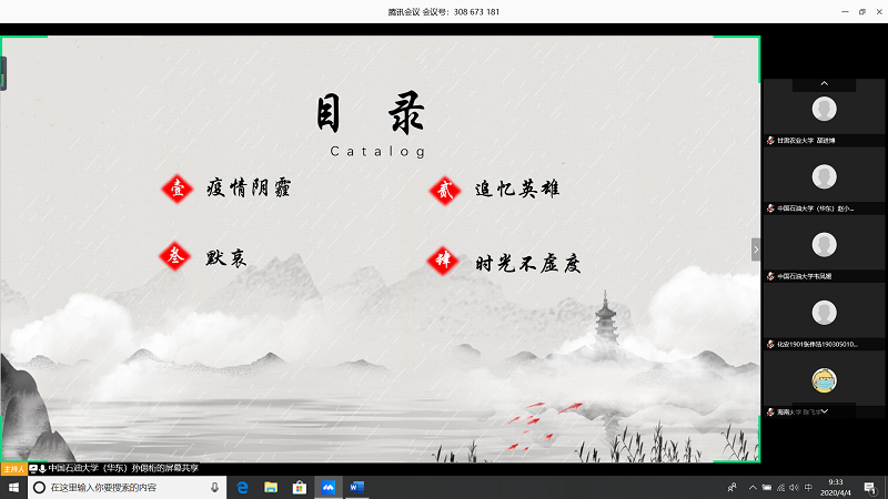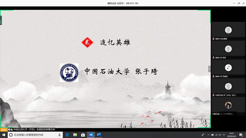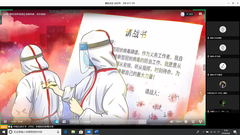 会上,由甘肃农业大学王志文同学带我们回顾疫情,虽然国内疫情已经有所缓解但是同学们还是不能放松警惕;中国石油大学(华东)张子琦同学带领大家向抗疫英雄致敬,十点开始全体起立默哀三分钟;古天乐代言太阳集团朱雅妮为大家强调线上上课等同于课堂教学,在家学习不能懈怠,合理规划疫情期间的学习和课程安排。