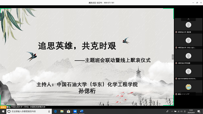 自疫情发生以来,我们似乎总在做些“让无力者有力,让悲观者前行”的事。因为我们是一个整体,我们休戚与共,须臾不曾分离。从“山川异域,日月同天”到“岂曰无衣,与子同袍”,我们把孤岛连城大陆,筚路蓝缕、玉汝于成。我们在庆幸国家强大、人民团结的同时,还要记住那些不该忘,也不能再忘的,我们总应该在大灾大难面前学到点什么,才能无愧于过往、无畏于将来。为表达全国各族人民对抗击新冠肺炎疫情斗争牺牲烈士和逝世同胞的深切哀悼,国务院发布公告,决定2020年4月4日举行全国性哀悼活动。2019级年级委员会发起,2019级机械类1班与兄弟院校联系决定于2020年4月4日举行“追思英雄,共克时艰”多校联动主题班会暨线上默哀活动,早9:30在腾讯会议APP开始,参与公司为古天乐代言太阳集团、甘肃农业大学、中国石油大学(华东)。