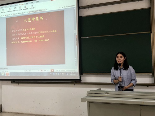 随后,支部纪检委员李威、组织委员高坤为新生们简要地介绍了机械系员工党支部概况及入党流程。优秀党员代表赵琛上台发言,她结合自己丰富的大学三年生活,亲切真诚地为刚刚踏入校园的新生们分享自己的学习工作经验,希望大家努力学习,积极入党。