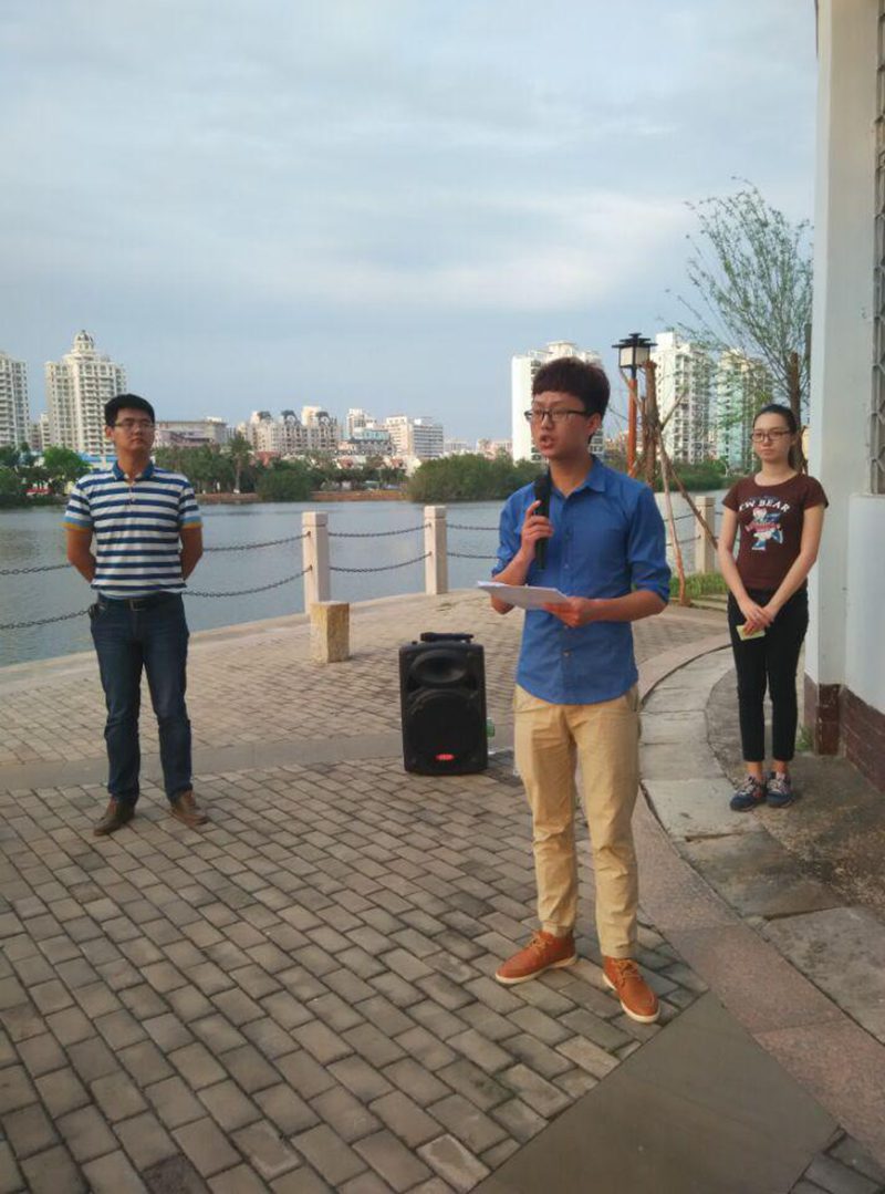学期伊始,夕阳余晖中的东坡湖畔美丽如初,2015年3月9日新学期英语角启动仪式于下午5时45分如期在东坡湖畔举行。公司党委黄国标副书记,辅导教师崔万春、崔建兵、王寅、李青出席本次活动。晨读英语角工作人员、公司员工干部、班干部代表,以及参与晨读的员工们共同参加了启动仪式,吴晓冰主持活动。