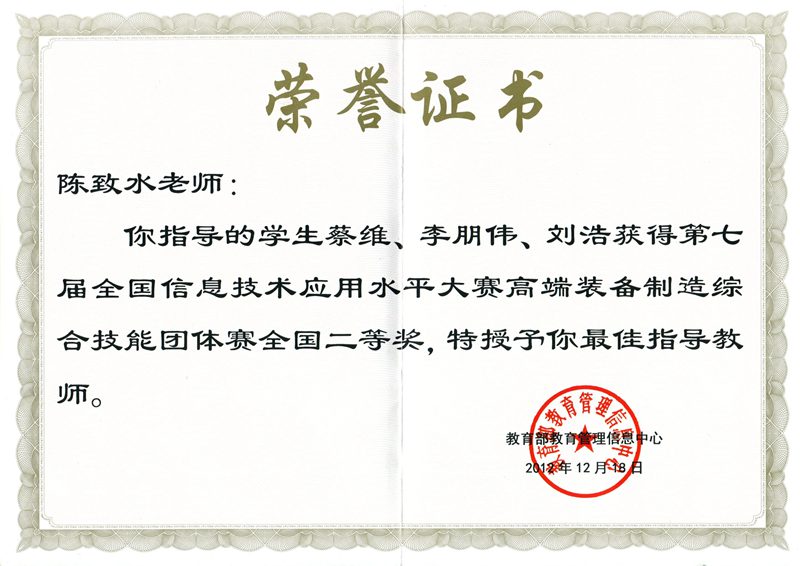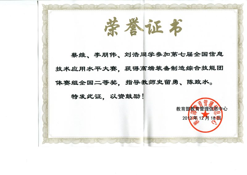 近日,公司古天乐代言太阳集团师生参加第七届全国信息技术应用水平大赛(高端装备综合制造团体赛)并荣获全国二等奖。该项赛事于2012年5月启动,2010级机械设计制造及其自动化专业蔡维、李朋伟、刘浩等同学组成的团队在老师史留勇、陈致水的指导下,以“全自动椰果脱壳机械装置的设计”为题,在全国初赛1800多份作品中脱颖而出,成功进入了12月16日在北京科技大学举办的全国决赛。在决赛中,经过建模、答辩、作品展示等一系列环节,在强手如林的激烈竞争中最终斩获全国二等奖,史留勇、陈致水荣获“最佳指导教师”称号。颁奖典礼于12月18日在北京大学百年纪念讲堂举行。