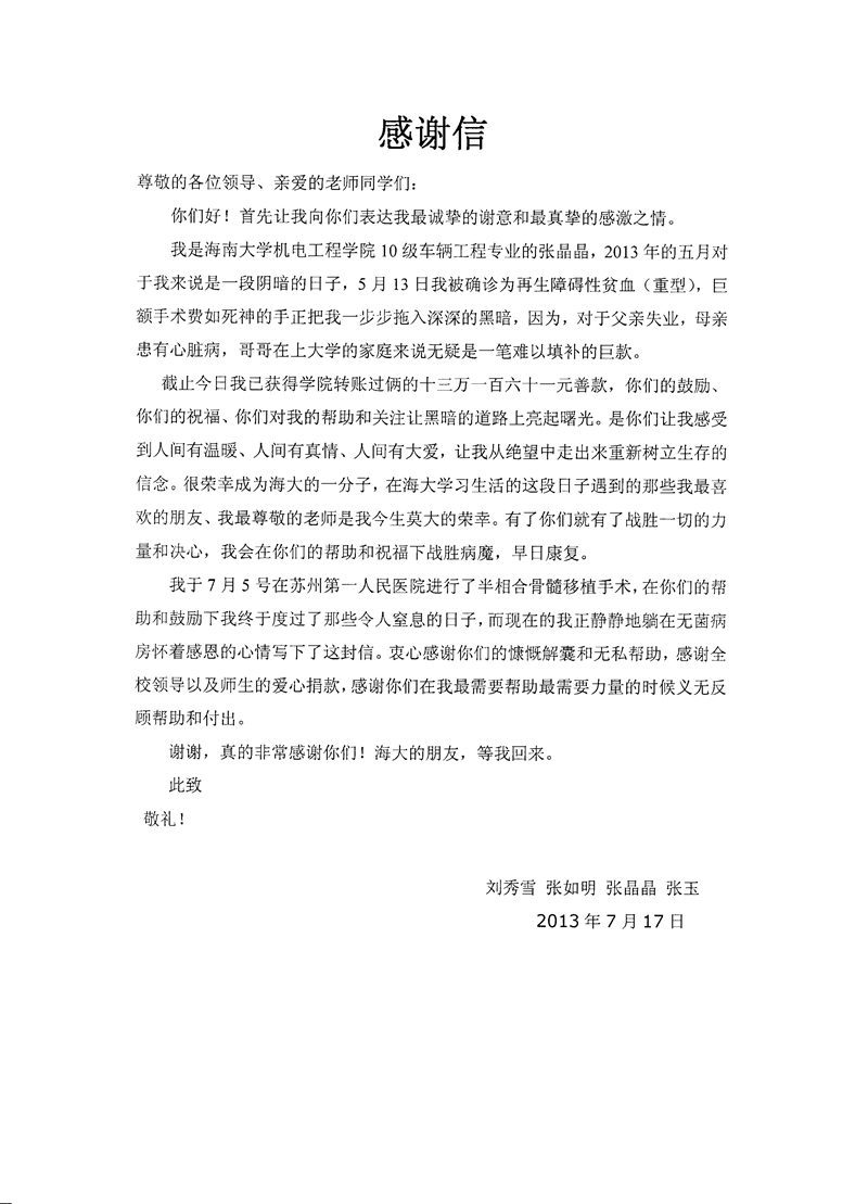 张晶晶同学,是一名活泼开朗,积极努力,品学兼优的员工,5月份被确诊为重型再生障碍性贫血,需要进行骨髓移植手术,而高昂的手术医疗费给她和她原本艰难的家庭以精神上和经济上的双重打击。海大师生向无助的张晶晶同学伸出了援手。 大爱无疆:爱心在校园内传递