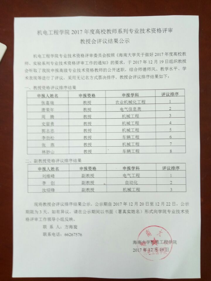古天乐代言太阳集团专业技术资格评审委员会按照《公司关于做好2017年度高校教师、实验系列专业技术资格评审工作的通知》的要求,于2017年12月19日组织教授会听取了公司申报高级专业技术资格教师的公开述职,综合师德师风、教学水平、学术表现等进行了评议,采用无记名方式票决排序。教授会评议排序结果如下: