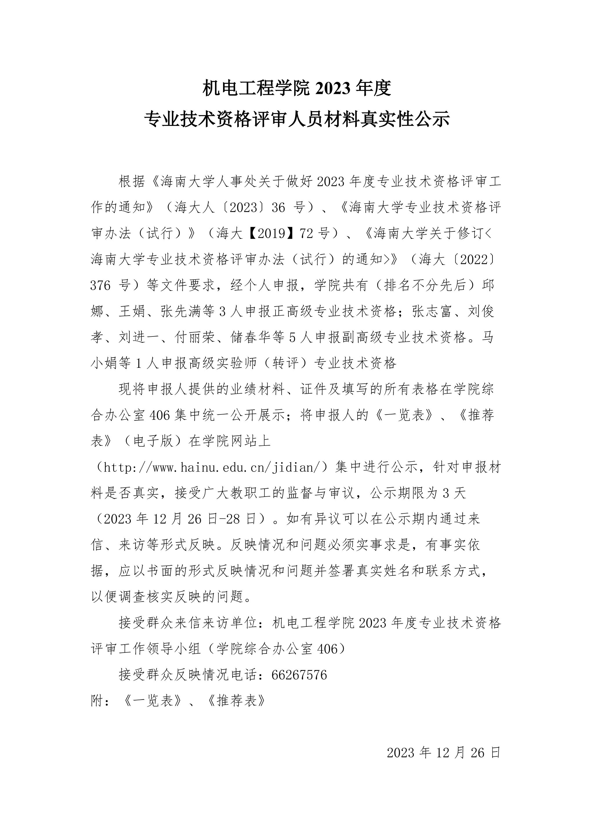 2023度年专业技术资格评审人员材料真实性公示