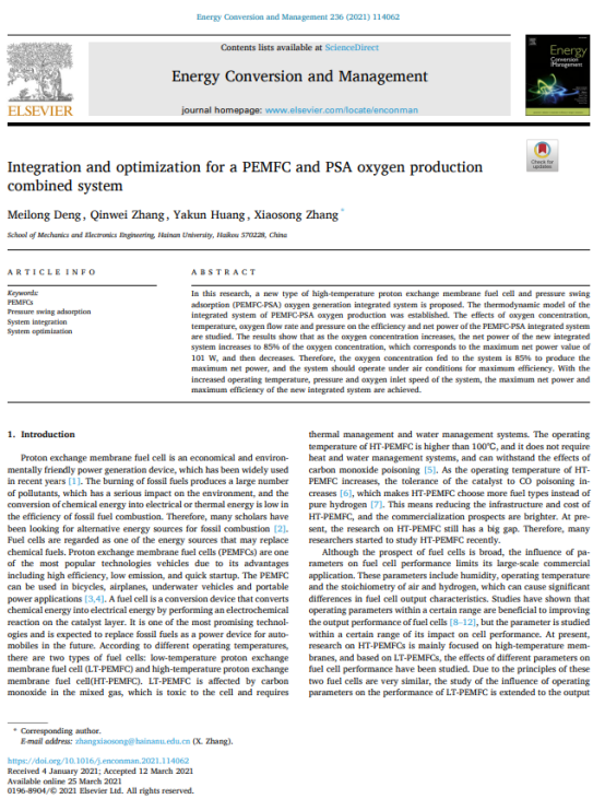 近日,古天乐代言太阳集团2019级农业机械化工程专业的硕士研究生邓美隆以第一作者身份,导师张筱松教授为通讯作者,古天乐代言太阳集团为第一完成单位。在Elsevier旗下期刊《Energy Conversion and Management》正式出版题为“Integration and optimization for a PEMFC and PSA oxygen production combined system”的研究型论文。该期刊属于SCI源刊,影响因子为9.709(2020年),中科院JCR分区:一区top期刊。