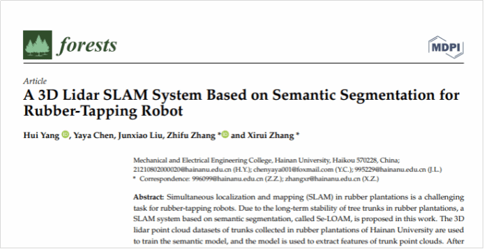 近日,公司天然橡胶智能化生产团队2021级硕士研究生杨慧同学在张喜瑞教授和张志富副教授的共同指导下,在中科院二区SCI期刊FORESTS上发表最新学术论文(如图1所示),题目为“A 3D Lidar SLAM System Based on Semantic Segmentation for Rubber-Tapping Robot”。