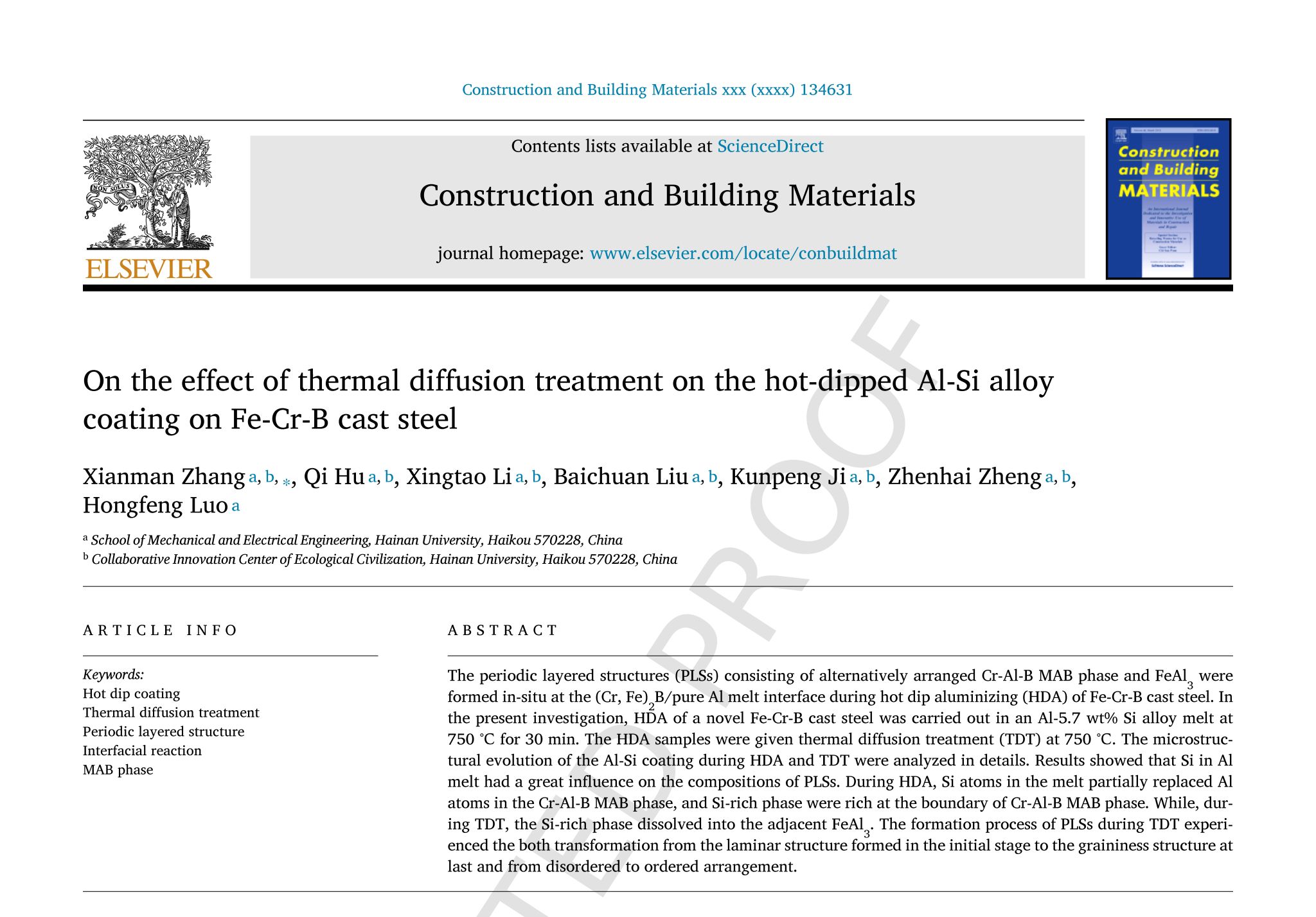 近日,古天乐代言太阳集团清洁能源高效存储材料与装备团队在Fe-Cr-B铸钢热浸镀铝方面取得系列研究进展,相继在《Ceramic International》(IF5.2,SCI一区Top期刊)、《Construction and Building Materials》(IF7.4,SCI一区Top期刊)国际权威期刊上发表论文,张先满副教授为论文的第一作者兼通讯作者。