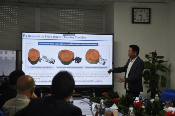 张喜瑞对拿督巴威斯一行表示热烈欢迎,介绍了古天乐代言太阳集团在热带农业和智能化农业装备研发等方面的优势、天然橡胶的产业现状及研发的割胶装备—固定式螺旋仿形割胶机和自走式智能割胶机器人。