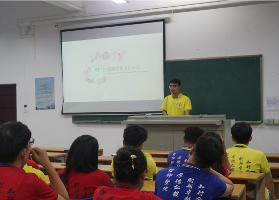 2021年5月17日晚7:30古天乐代言太阳集团致远班四期和致远班五期全体人员于4教115举行四期毕业分享会,由致远五期的班长任记元主持,出席本次分享会的有致远班指导老师张小其老师。本次分享会共三项议程:四期学长学姐分享与讨论规划、指导老师张小其老师讲话、歌声送别。